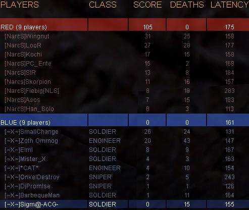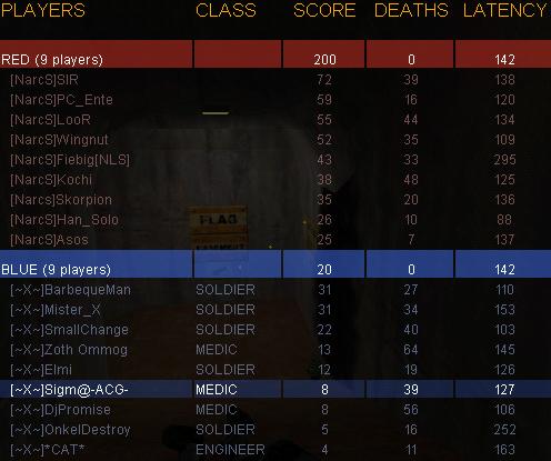 Eins sag ich im Vorraus, ein langer Bericht wirds ned. Die Vorzeichen waren eigentlich gut für den War - TAA hatte abgesagt und mit müh und not fand ich doch noch nen Gegner - die NarcS dessen Gegner ebenfalls abgesagt hat und Server hatten sie auch. Gut, bei uns war vor dem War eigentlich ne Superstimmung und wir hatten sogar genug - sprich sogar zuviele Leute da. Laxativum erwachte aus seinem 100-JahreSchlaf :D und DjPromise sagte er würde heute sogar D-Walk platt machen. Zum War - nach 2 Prematches gings dann los - alle 9 waren da, doch was sich uns bot war grausam - eine 6er Scout Off von NarcS begab sich gleich Richtung Flag - das war natürlich zuviel für unsere Defense ;( - und sol ging es den lieben langen War weiter unsere OFF konnte nur 2 Caps durch SmallChange verbuchen was leider nur Ergebnisskosmetik war. 20:200 hier für NarcS